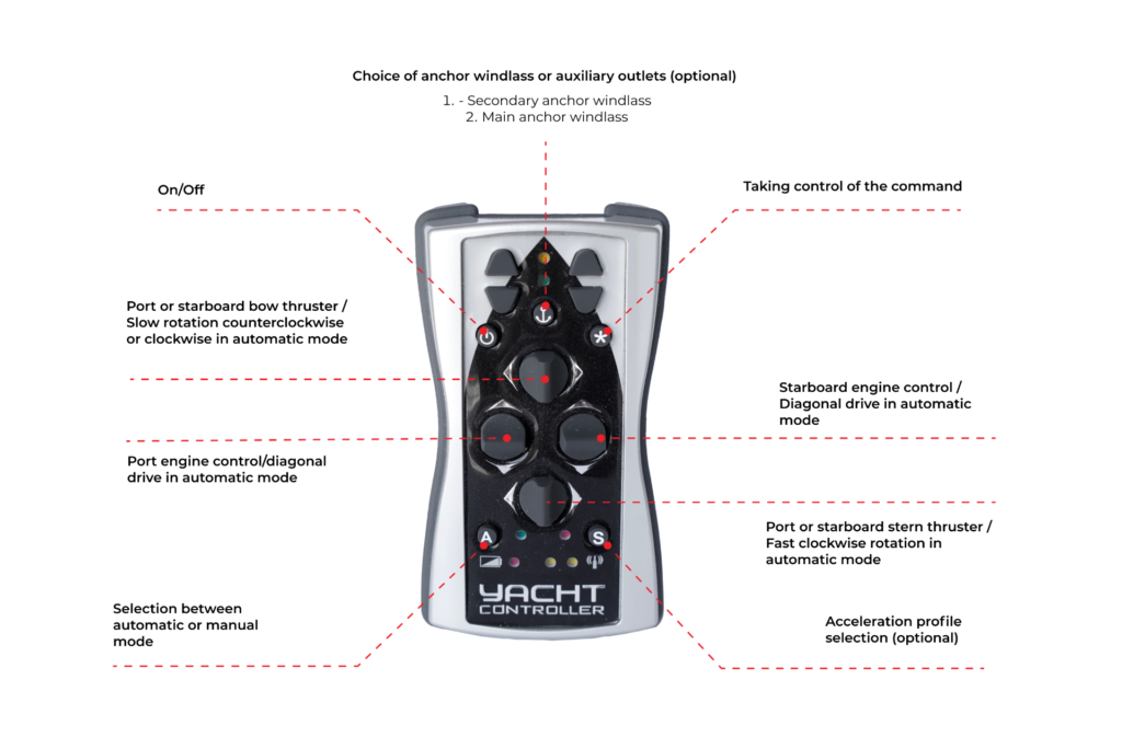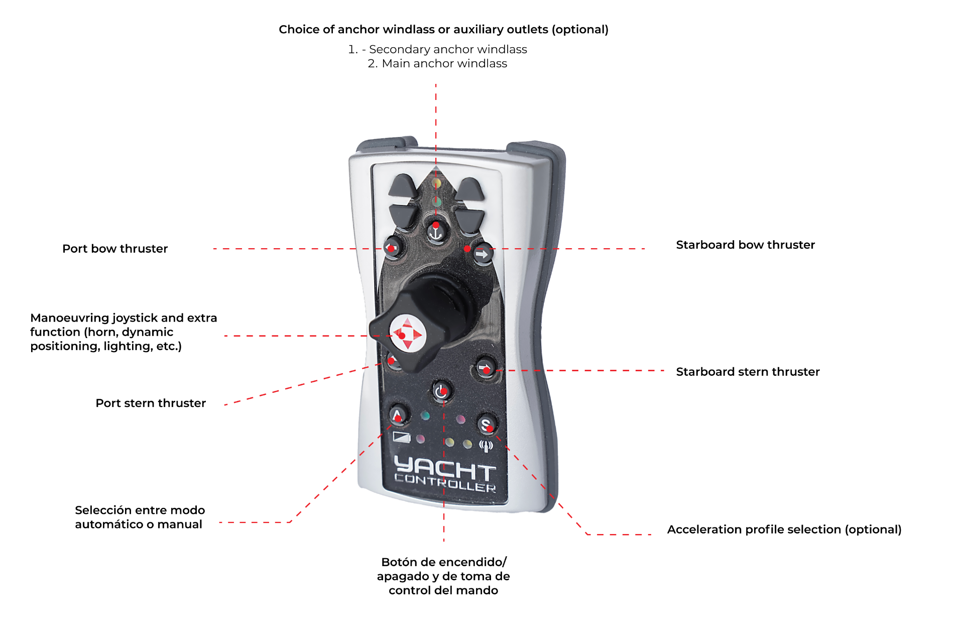 The engines, thrusters and anchor windlass(es) are operated from the control unit.